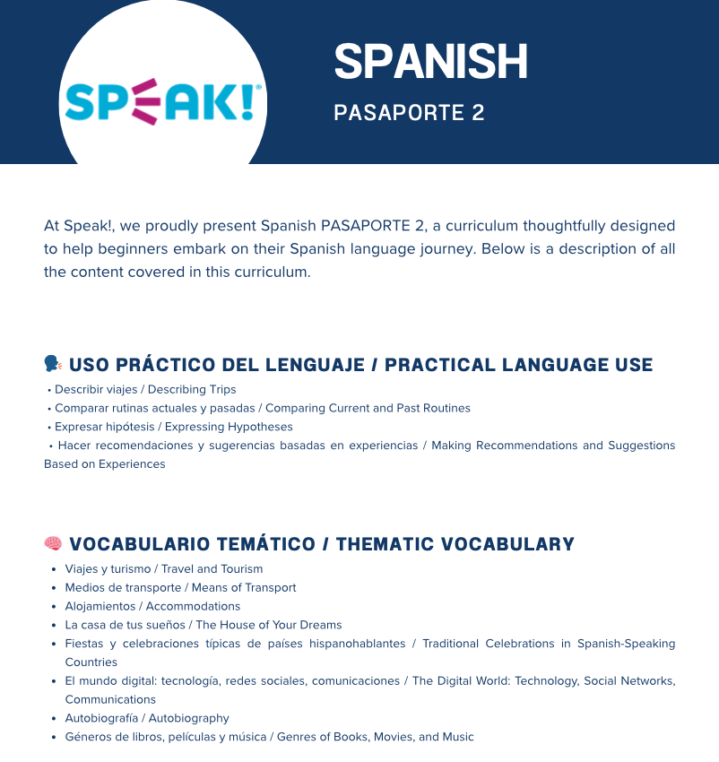 Speak! with Confidence: Our courses focus on conversational Spanish, helping you break through barriers and start speaking from day one.